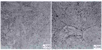 (1)該杠桿銷釘化學成分合格,金相組織粗大,可見黑色網狀奧氏體晶界,粗晶2級,硬度高,沖擊韌性低,金相組織、硬度、沖擊功均不滿足標準要求。