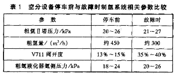 在結霜部位上方有以下液體閥門:手動閥V702(粗氬冷凝器液氬回流閥)、手動閥V704(粗氬冷凝器液空恒流閥)、氣動調節閥V711(粗氬液化器液氮調節閥)、氣動調節閥V706(精氬冷凝器液氮調節閥)和手動閥V714(精氬冷凝器液氬回流閥)。根據施工圖紙確定冷箱西側結霜位置內部管道布置稀少,所以判斷為上述幾個閥門或閥門前后管道出現了問題。此時有操作人員反映,此次投產空分設備時V711閥的開度要比停運前大很多,相關參數比較見表1。