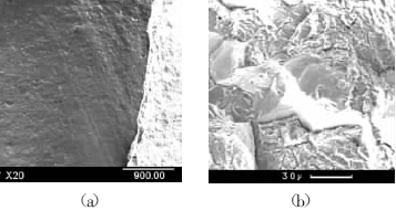 因為2#、3#調節閥斷口磨損嚴重,把1#調節閥斷口放入電鏡觀察,微觀形貌如圖2所示,斷口源區磨損較為嚴重,擴展區有明顯的貝紋線,收斂于斷口邊緣的螺紋處,見圖2(a),斷口擴展區大部分是解理斷裂,見圖2(b),斷口上未見疲勞輝紋。