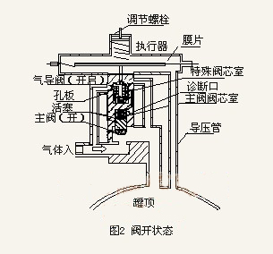 如圖1所示,當(dāng)?shù)忾y關(guān)閉時(shí),主閥的活塞是在一個(gè)密封室內(nèi),當(dāng)儲(chǔ)罐壓力等于或大于設(shè)定的壓力時(shí),膜片就被向上頂起,氣導(dǎo)閥在彈簧的作用下向上移動(dòng),把氣導(dǎo)閥上的密封圈緊緊壓在閥座上,關(guān)閉了控制氣的進(jìn)口,同時(shí)特殊閥芯室的壓力增加并接近氮?dú)饪偣艿膲毫Γ藟毫νㄟ^(guò)內(nèi)部通道,從特殊閥芯室傳到主閥閥芯室。主閥的活塞就處于氮?dú)饪偣軌毫Φ淖饔茫捎谥鏖y閥芯上、下所受氣體壓力平衡,所以主閥閥芯在自重和彈簧的作用下將閥門(mén)緊密關(guān)死。