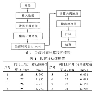 由于采用手工方法計(jì)算工作量很大 , 所以采用VB 6 1 0 編程語言計(jì)算 ( 圖3)。計(jì)算得到關(guān)閥時(shí)間t =3 1 62s 。閥芯移動(dòng)速度值如表 1 所示。