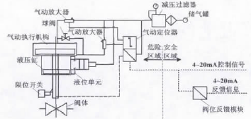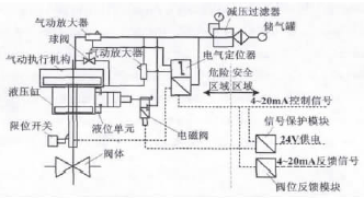 圖2 電氣定位器控制原理圖 3 現有調節閥安全模式 3.1 方案分析 氣動調節閥實現了出站壓力的調節控制,電氣定位器能夠使其在全行程上進行移動。執行機構可以連續地做增壓或者減壓的調整,以達到較好的控制效果。但調節閥執行機構存在故障狀態下安全模式選擇的問題。安全模式的選擇首先要保證生產的安全性,其次是生產的連續性。由于長輸管道的特殊性,要求當調節閥出現故障時,調節閥處于保位狀態。 3.2 保位措施 調節閥的故障狀態有斷氣、斷電和斷信號三類。 在斷氣故障狀態,連接到液壓單元的氣壓信號中斷,液壓單元的內部液壓油路被關閉。由于液體是不可以壓縮的,液壓缸內的閥桿無法移動,因此執行機構被鎖定,實現保位功能。由于供氣管線安裝有壓力變送器,當調節閥出現斷氣故障時,站控制系統發出氣源壓力低報警信號,提醒工作人員及時處理并檢查調節閥狀態信息。 在斷電故障狀態,由于控制系統電源采用在線式不間斷電源(UPS)供電,且后備電池時間為2h,因此調節閥不考慮斷電時的保位措施。 在斷信號故障狀態,DVC6010無法切斷液壓單元的氣壓信號,因此無法實現保位功能。 4 改造后調節閥安全模式 針對斷信號故障狀態下無法實現保位功能的問題,對調節閥執行機構進行改造。在電氣定位器和執行機構之間加裝電磁閥,控制室增加信號保護模塊,實現調節閥斷信號保位功能。改造后調節閥控制原理圖如圖3所示。