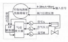 圖1 調節閥控制原理圖 2.2 電氣定位器控制原理 FISHERDVC6010電氣定位器是基于微處理器將電信號轉換成氣動信號的儀表。微處理器將給定值與閥門形成的反饋值進行比較,當出現偏差時,微處理器依據偏差的大小和方向輸出一個驅動信號。該驅動信號通過電氣(I/P)轉換器,將電信號轉換成氣動信號,再通過氣動放大器放大,按照位置方向輸出給氣動執行機構。執行機構依據接收的信號A或者信號B進行上下移動,從而使閥門開度在全行程上進行移動。電氣定位器控制原理圖如圖2所示。